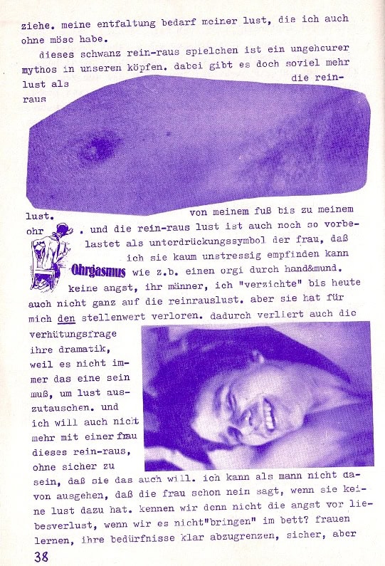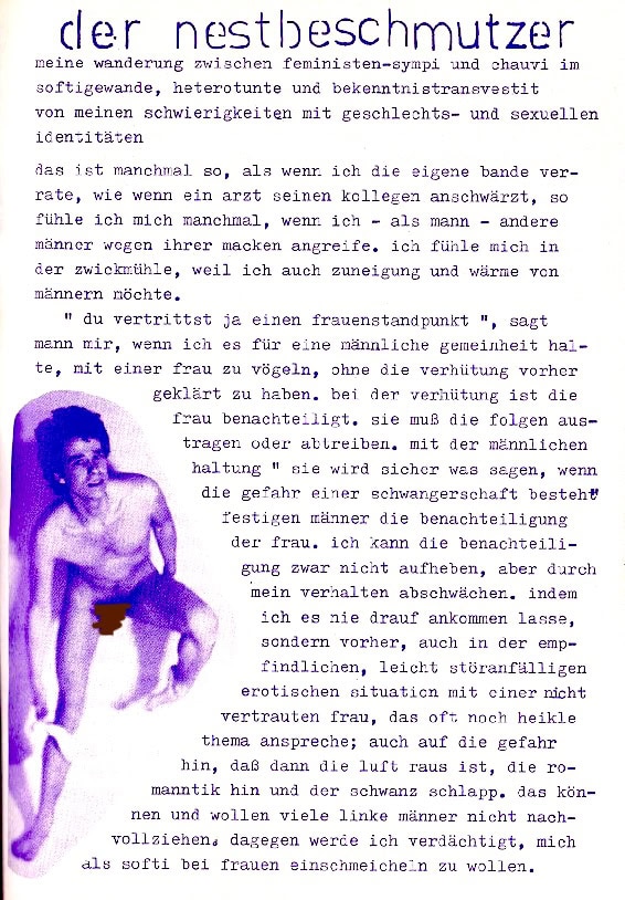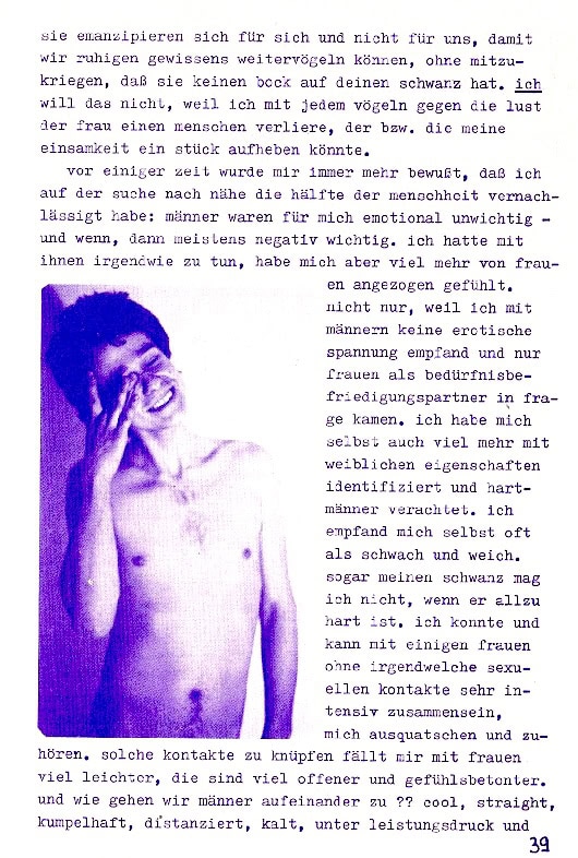 Ich empfinde es als mein ureigenstes Bedürfnis, keine Gewalt auszuüben, weil sie mich einsam macht. Deswegen identifiziere ich mich mit Frauen, die mit den Kindern die Letzten in der Kette der Unterdrückung sind. Deswegen will ich auch nicht hinter den Vorwürfen und Angriffen der Frauen zurückbleiben, will mich nicht gegen sie schützen, sondern sie für mich und meine Entfaltung nutzen. Eine solche Entfaltung ist aber solange blockiert, wie ich mein Selbstbewusstsein aus dem Abspritzen in eine Frau ziehe. Meine Entfaltung bedarf meiner Lust, die ich auch ohne Möse habe.