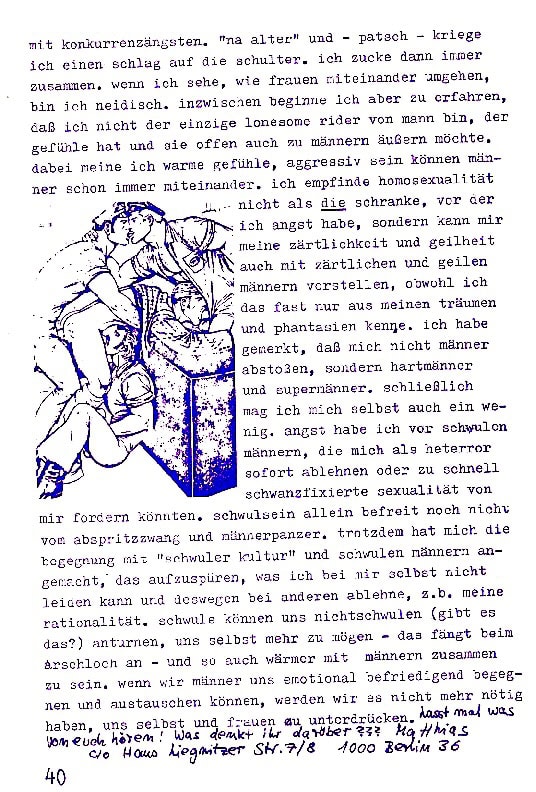 Angst habe ich vor schwulen Männern, die mich als Heterror sofort ablehnen. Oder zu schnell schwanzfixierte Sexualität von mir fordern könnten. Schwulsein allein befreit noch nicht vom Abspritzzwang und Männerpanzer. Trotzdem hat mich die Begegnung mit „schwuler Kultur“ und schwulen Männern angemacht, das aufzuspüren, was ich bei mir selbst nicht leiden kann und deswegen bei anderen ablehne, z. B. meine Rationalität. Schwule können uns Nichtschwulen (gibt es das?) antörnen, uns selbst mehr zu mögen – das fängt beim Arschloch an – und so auch wärmer mit Männern zusammen zu sein. Wenn wir Männer uns emotional befriedigend begegnen und austauschen können, werden wir es nicht mehr nötig haben, uns selbst und Frauen zu unterdrücken.