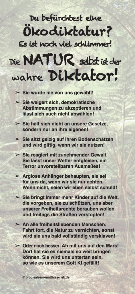 In letzter Zeit stolpere ich manchmal über die kühne These, wir lebten bereits am Beginn einer Ökodiktatur. Hier meine etwas launige Antwort … 😏